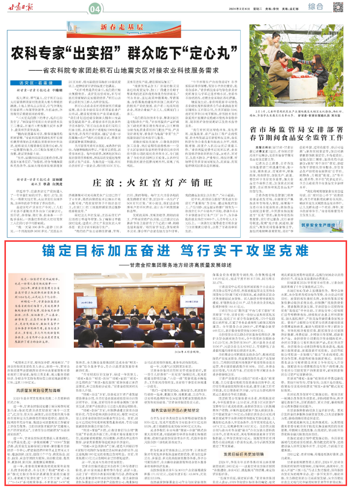 党建引领保障作用更加凸显:集团党委坚决贯彻落实“两个一以贯之”,把方向、管大局、保落实,基层党组织战斗堡垒作用和党员先锋模范作用在稳增长、促改革、防风险中充分彰显,集团公司思想政治工作被省上评价为优秀。金控担保集团被评为“党建融入生产经营示范点”,甘肃征信公司被评为“先进基层党组织”。