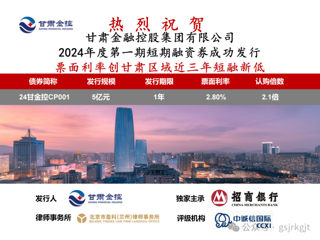 2024年2月6日,天博买球(中国)官方网站 成功发行2024年度第一期短期融资券,发行规模5亿元,债券期限一年,票面利率2.80%,债券票面利率创甘肃区域近三年同品种债券利率新低。