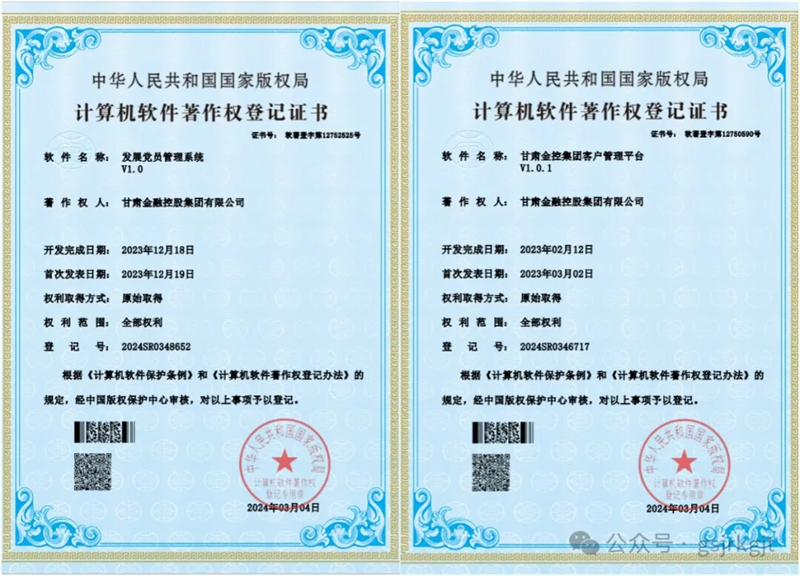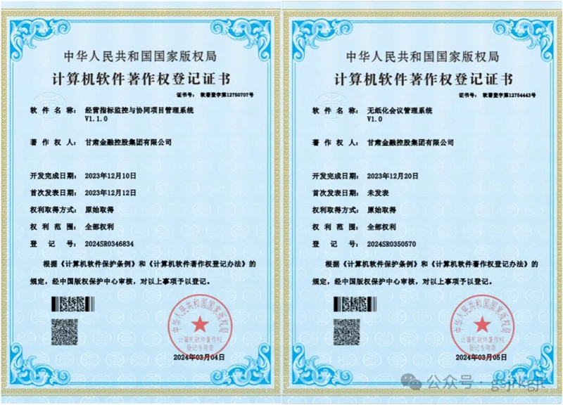 获得“无纸化会议管理系统”、“客户管理平台”、“经营指标监控与协同项目管理系统”和“发展党员管理系统”四项计算机软件著作权登记证书。本次获得证书的软件系统是集团在行政办公、经营管理和党建信息化建设方面的最新成果,标志着集团信息技术能力迈上新台阶。