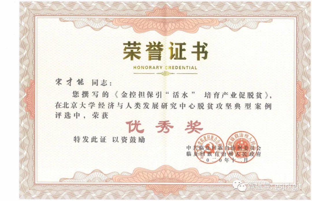 近期,临夏州脱贫攻坚典型案例评选活动落下帷幕,金控临夏担保推荐的《金控担保引活水,培育产业促脱贫》典型案例经北京大学课题组与临夏州委宣传部、州扶贫办、州文联、民族日报社多轮筛选评审,在北京大学经济与人类社会发展研究中心脱贫攻坚典型案例评选中荣获优秀奖,得到州委州政府表彰。