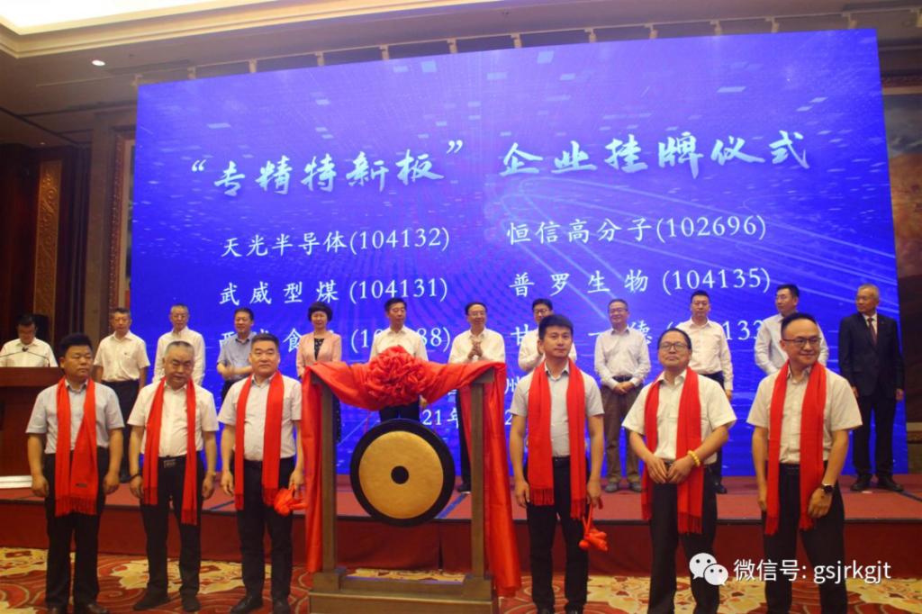 在各位领导的见证下,省法院副院长任建国、省人社厅副厅长何永强、省自然资源厅副厅长王驰分别与金控集团总经理雷铁签订战略合作协议;首批“专精特新”企业天光半导体、恒信高分子、武威型煤、普罗生物、西域食品、甘肃一德挂牌鸣锣,成功登陆甘肃股权交易中心“专精特新板”。