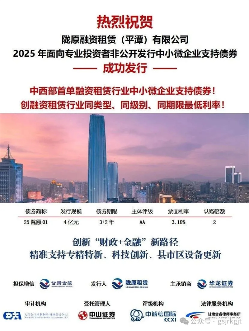 “财政+金融”模式优势,以财政政策引导、金融服务协同、投融资联动等方式,吸引资本市场资金全力支持我省实体经济。7月28日,陇原租赁在上交所成功发行中小微企业支持债券,规模4亿元,期限3+2年,票面利率3.18%,认购倍数2倍,是中西部省份首单融资租赁行业中小微企业支持债券,创融资租赁行业同类型、同级别、同期限历史最低利率。